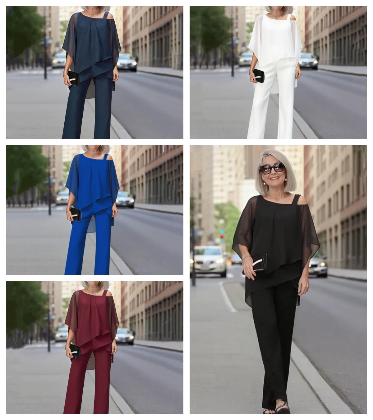 💎 50% KORTING – TIJDELIJKE ACTIE! 💎 2-Delige set voor dames: Asymmetrische chiffon top & broek met wijde pijpen – Soepelvallend, elegant & moeiteloos chic 👚👖