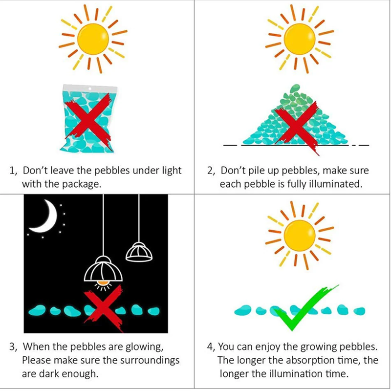 Voor een optimale gloed dient u de steentjes vóór het eerste gebruik enkele uren bloot te stellen aan direct zonlicht of fel kunstlicht.