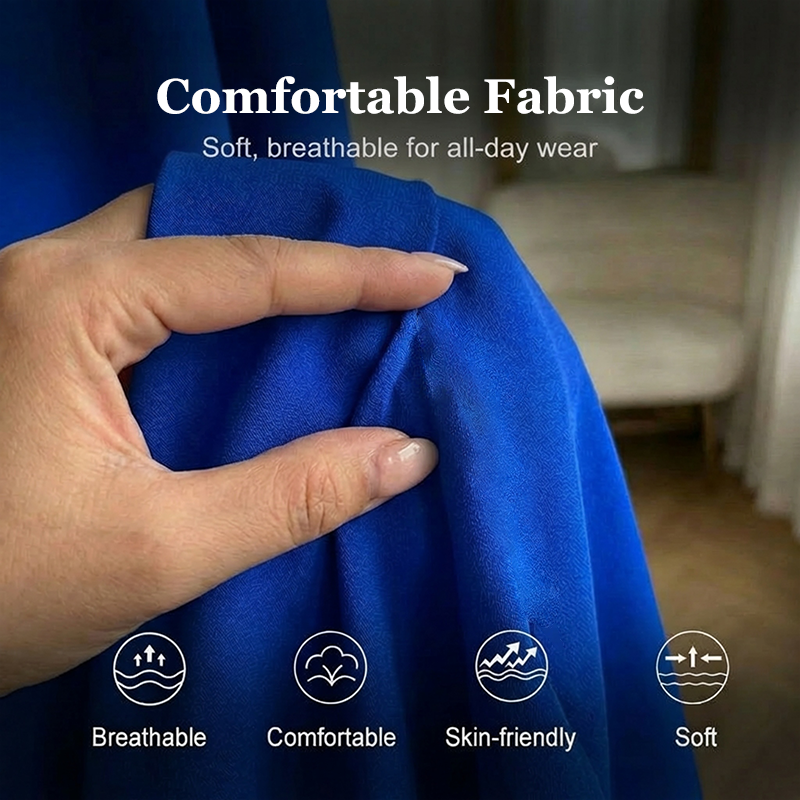 PREMIUM STOF - Deze jurk is gemaakt van een hoogwaardige stofmix en voelt uitzonderlijk zacht en comfortabel aan op de huid. De ademende eigenschappen zorgen ervoor dat je de hele dag koel en zelfverzekerd blijft, ongeacht de gelegenheid.