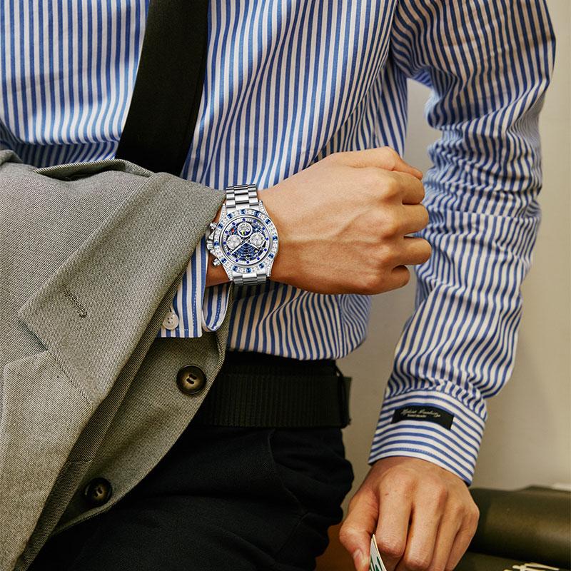 ZES-HANDIGE CHRONOGRAAFUURWERK Biedt nauwkeurige tijdmeting en stopwatchfunctionaliteit voor veelzijdig dagelijks gebruik, zodat u de verstreken tijd voor verschillende activiteiten, van sport tot vergaderingen, nauwkeurig kunt bijhouden.