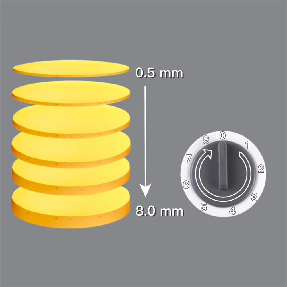 [Multifunctioneel]Ā Ā De messen bieden flexibiliteit om gemakkelijk fruit en groenten in vormen en maten te snijden, snijden, versnipperen en hakken.Ā Ā Zoals een aardappel, je kunt er gemakkelijk golvende of normale plakjes van maken, reepjes maken of pureren.