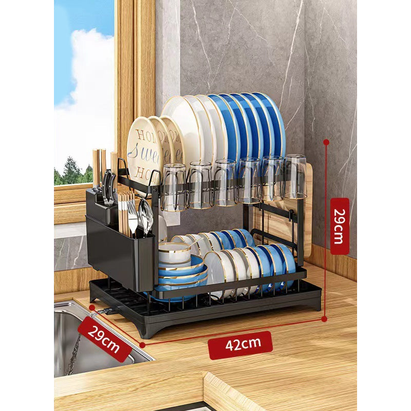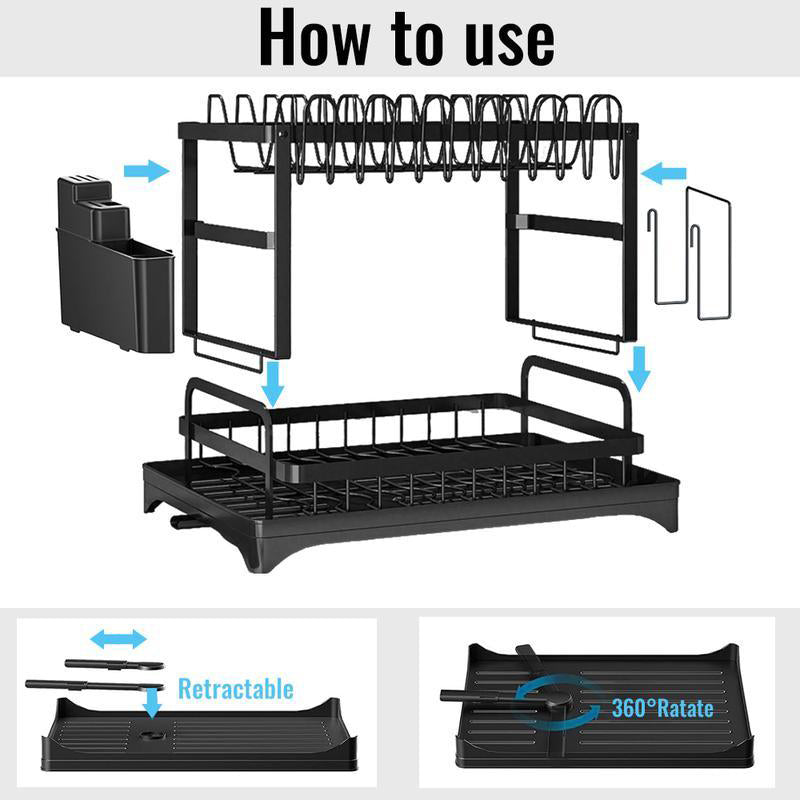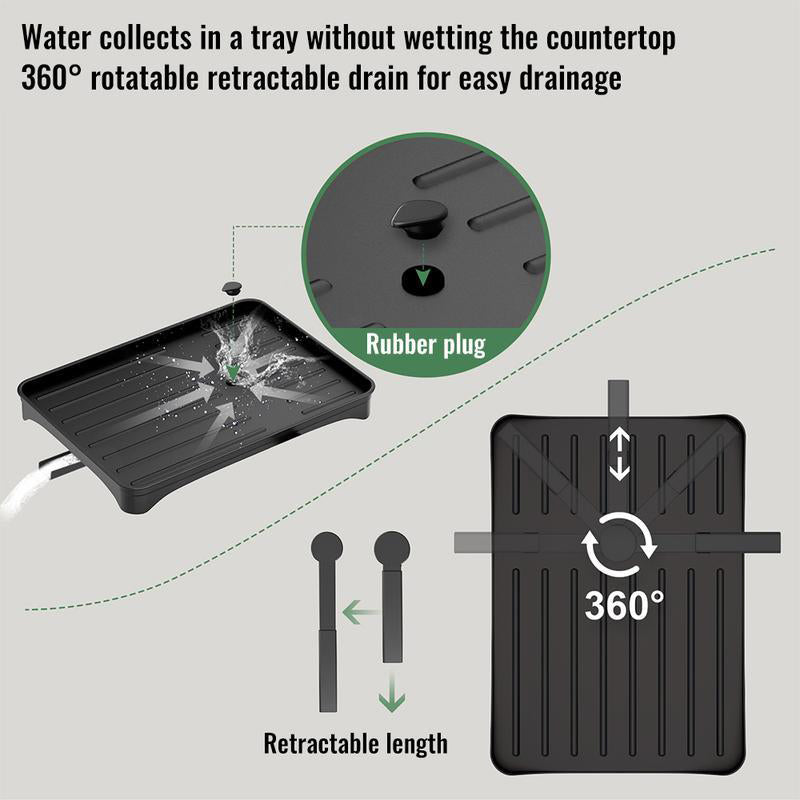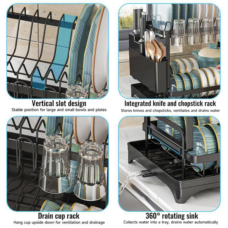 Meerlaags roestvrijstalen afdruiprek met een draaibaar lekbakje dat het water direct in de gootsteen leidt, waardoor uw aanrecht droog en netjes blijft.