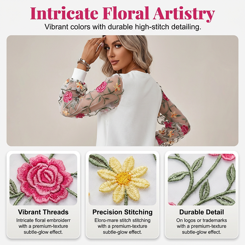 👗 NU 50% KORTING! 🌸 Damesjurk met geborduurde bloemenprint en mesh mouwen – doorschijnende botanische mouwen, relaxte pasvorm en ademend 🌿