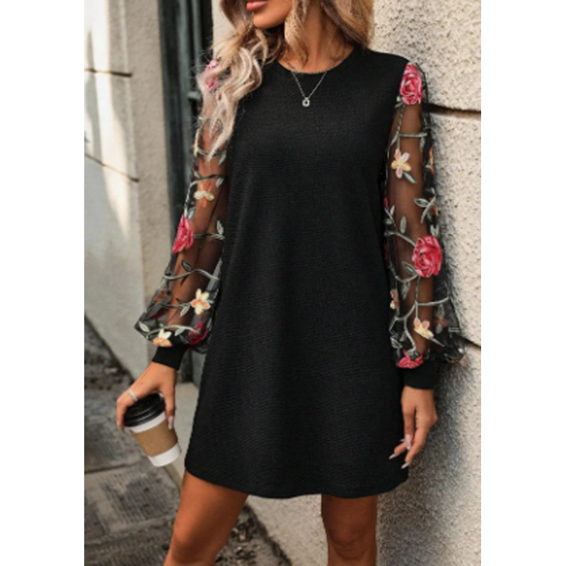 ELEGANTE MINIJURK MET BLOEMENBORDUURWERK - Geef je garderobe een upgrade met deze prachtige minijurk met doorschijnende mouwen en levendig bloemenborduurwerk. Perfect voor elke elegante gelegenheid.